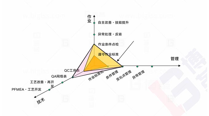 ![]() | 步驟7:質(zhì)量管理標(biāo)準(zhǔn)化 推進(jìn)目標(biāo) 從管理、技術(shù)、作業(yè)多個(gè)維度,調(diào)查、分析、完善生產(chǎn)工序的作業(yè)條件并固化到作業(yè)標(biāo)準(zhǔn)和日常管理中,提升制造質(zhì)量水平。 推進(jìn)思路 上海博革咨詢采用DFMEA、PFMEA、QC工程圖、作業(yè)SOP、檢驗(yàn)SOP、4M變更管理等工具對(duì)每個(gè)工序的自工序完結(jié)度進(jìn)行作業(yè)要素級(jí)別的評(píng)估衡量,并持續(xù)改善,確保不接受不合格品、不生產(chǎn)不合格品、不流出不合格品的目的。 |