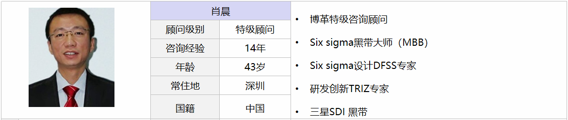 實戰經驗:豐富的企業導入精益Six sigma管理,變革企業文化和提升員工素質水平,診斷、細化、優化、再造企業核心流程,引入世界先進管理手段都有豐富的經驗。 曾為幾十家企業提供精益Six sigma項目咨詢服務,主導10余家企業的精益Six sigma管理, 輔導超過500個精益Six sigma項目, 授課人數超過1500人次,為企業帶來超過8000萬的項目收益,受到顧客的高度認可。曾為企業培養內部講師、內部黑帶大師、內部管理師超過200名,很多學員走上更高領導崗位,適合企業持續管理推進的需要。 曾在國內知名電器企業任職總裁辦公室高級經理,主要負責企業Six sigma管理的推進,企業內部Six sigma授課,精研統計技術和統計軟件,熟悉各種方法論的現場實踐,具有豐富的實操經驗和能力。
