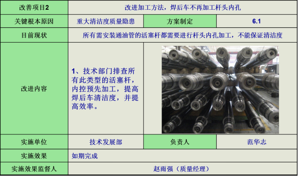改善前:清潔度問題(焊后車鐵屑雜質、芯管組焊焊瘤、鍍后焊焊瘤、芯管試驗油液污染、鍍后去堵鐵屑)不良率高達10000PPM,經過項目改善,為700PPM,合計年收益約為24萬元,達成項目目標。