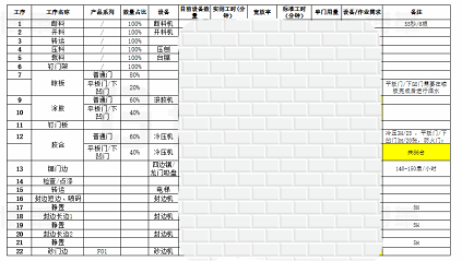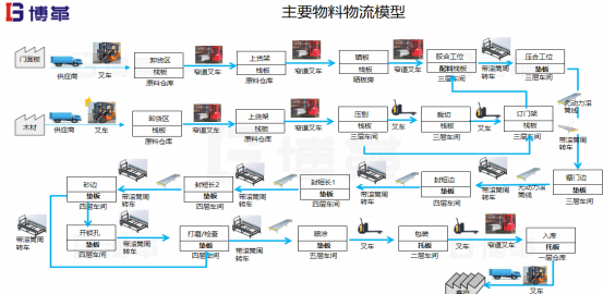 1) 開料-壓料-訂門架-半成品放置-膠合-冷壓-半成品放置-鋸門邊,整個過程存在多次回流搬運現象。