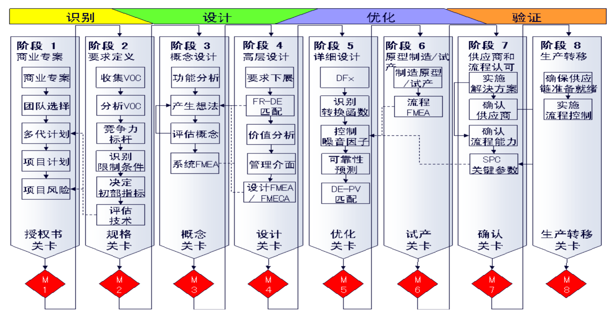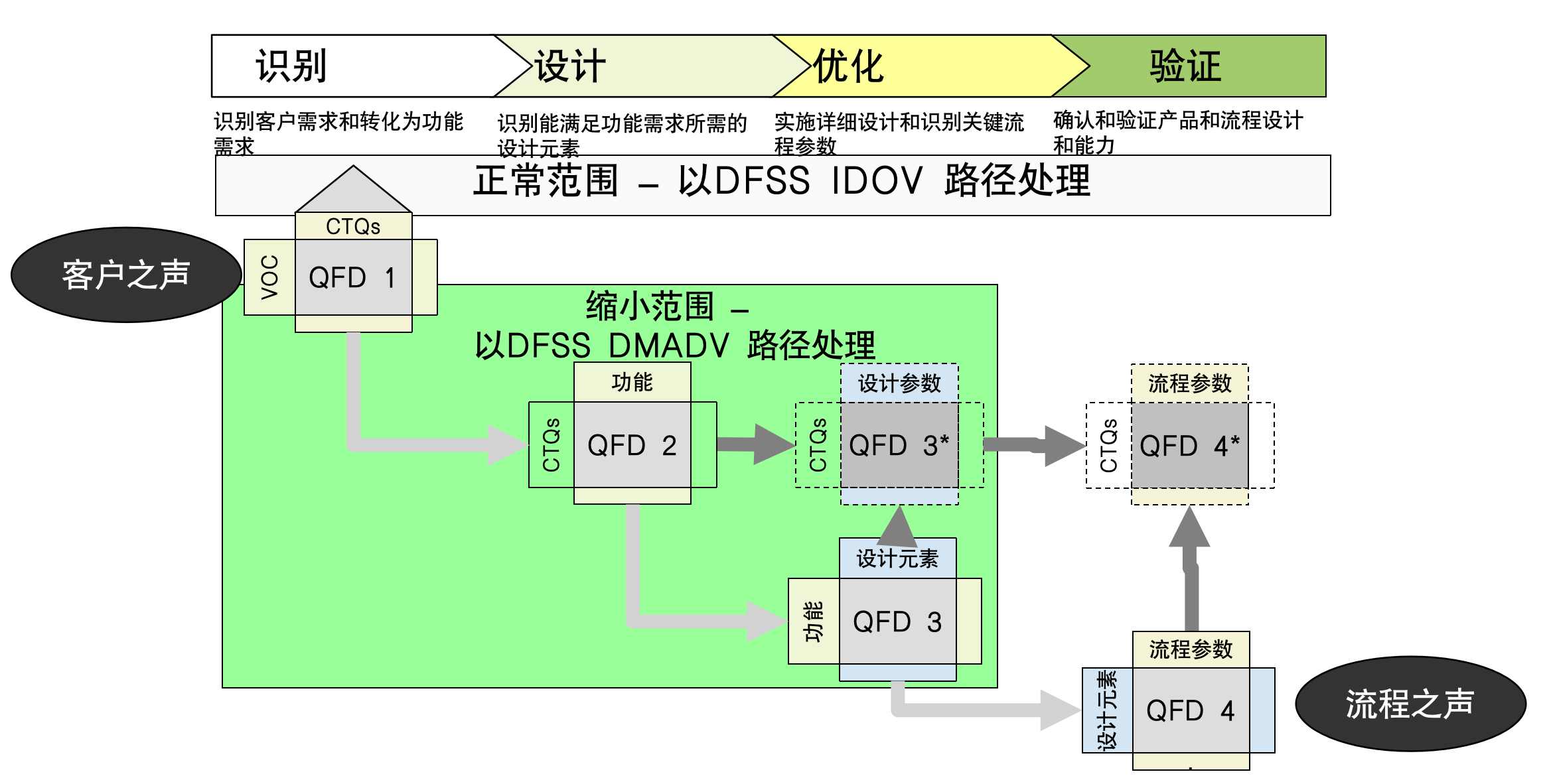 DFSS 的DMADV 路徑以關(guān)鍵CTQ 為骨干, 將客戶關(guān)注的問題, 作出分析, 生成改善概念并作出驗證, 確保能達(dá)到客戶對這個問題的要求