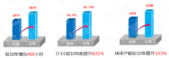 通過以提高設備綜合效率OEE為主要手段的一系列措施實施,綜采較2010年增加實際作業(yè)生產時間468小時,可多產煤80多萬噸。目前綜采OEE較2010年提升8.51%;產能較2010年提升10.5%;